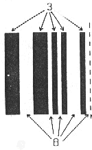 of 5碼(簡稱I25碼)即一個字元由5條線條所組成,裡頭有兩條是粗的線條;而所謂的交錯式即5條黑色線條及5條白色線條,穿叉相交而成. 如下圖所示